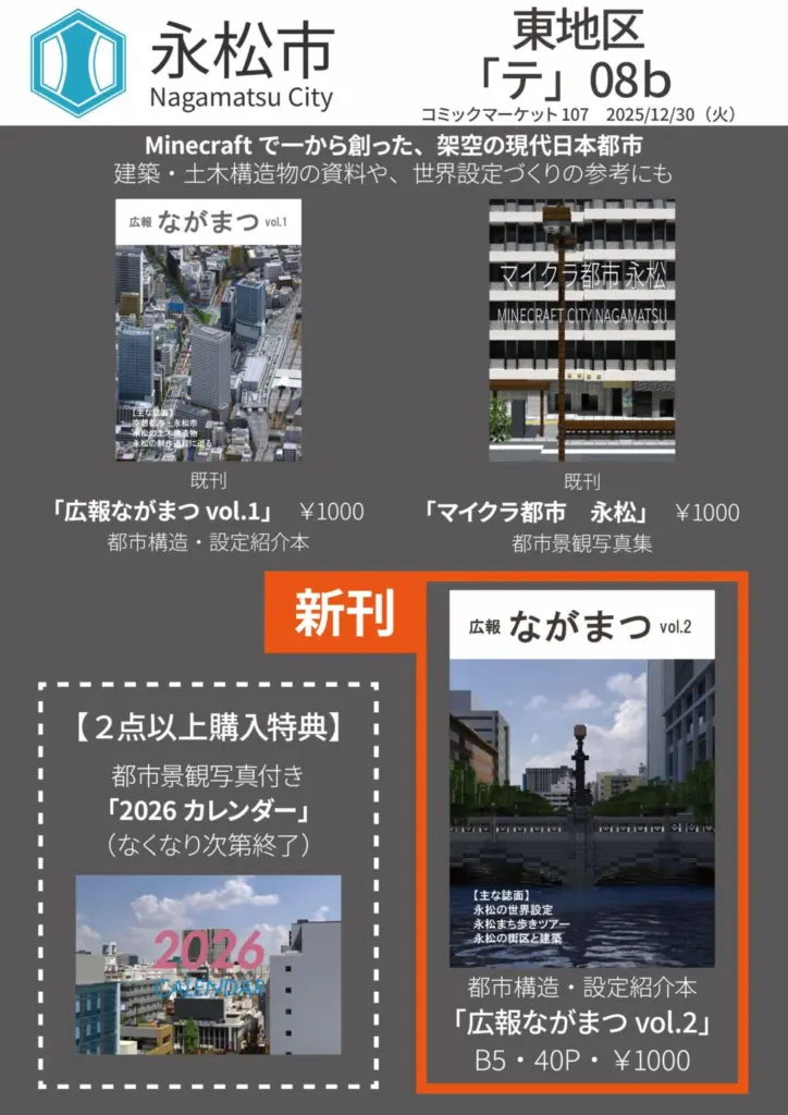 いずれの会場でも、コミックマーケット106で頒布した永松市の広報誌のほか、永松市の都市景観作品を中心とした冊子やカレンダーを頒布予定です。