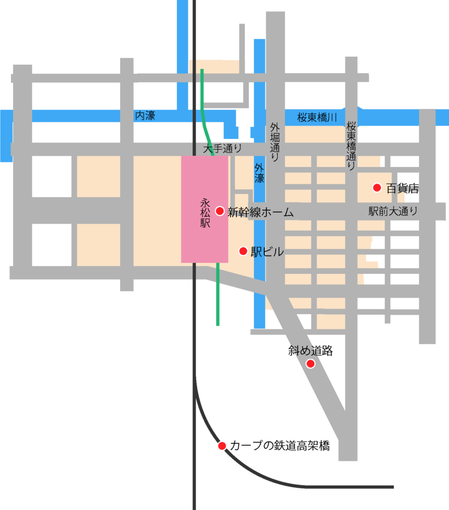 ちなみに、茶色の線は軌道(路面電車)です。画像右端付近で道路上から専用軌道になっています。これも都市構造に変化をもたらしたかった故の設計でした。