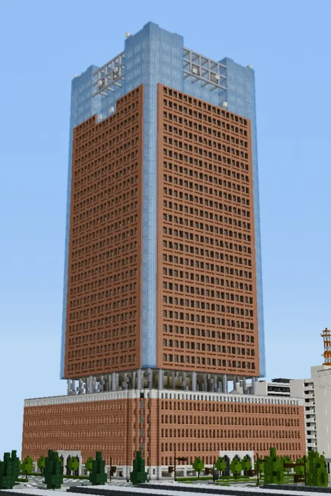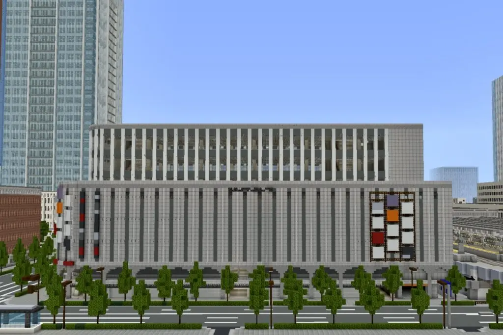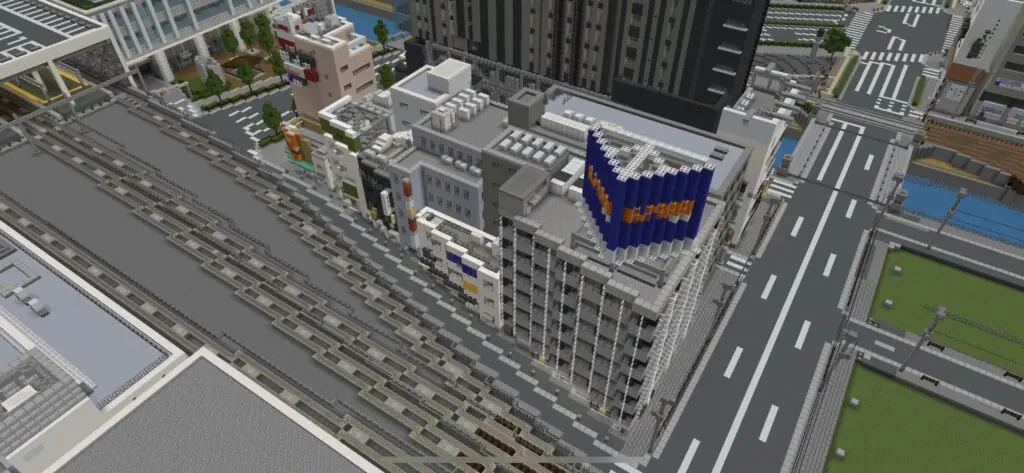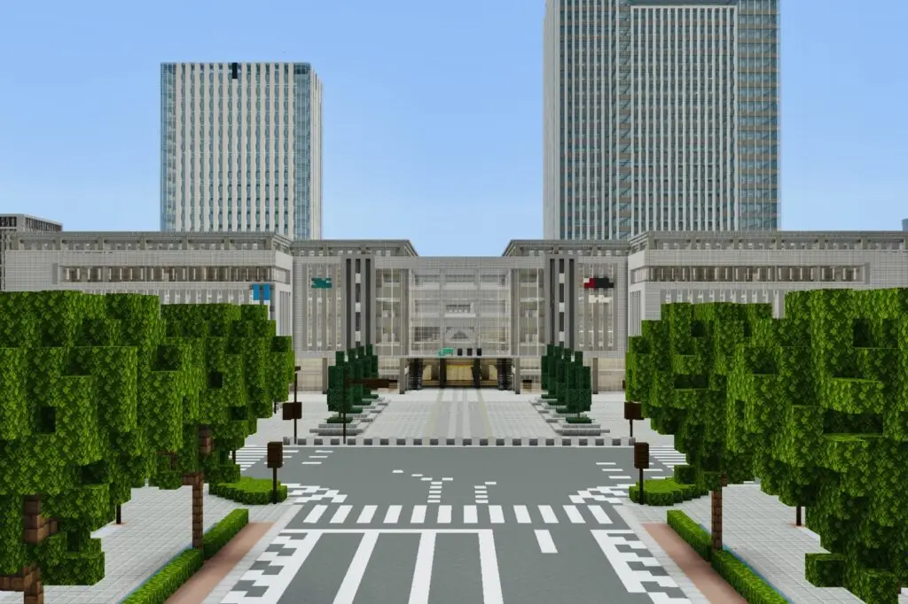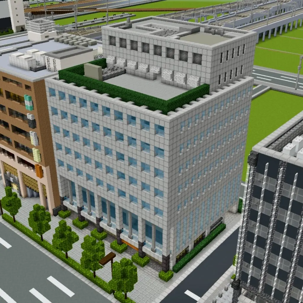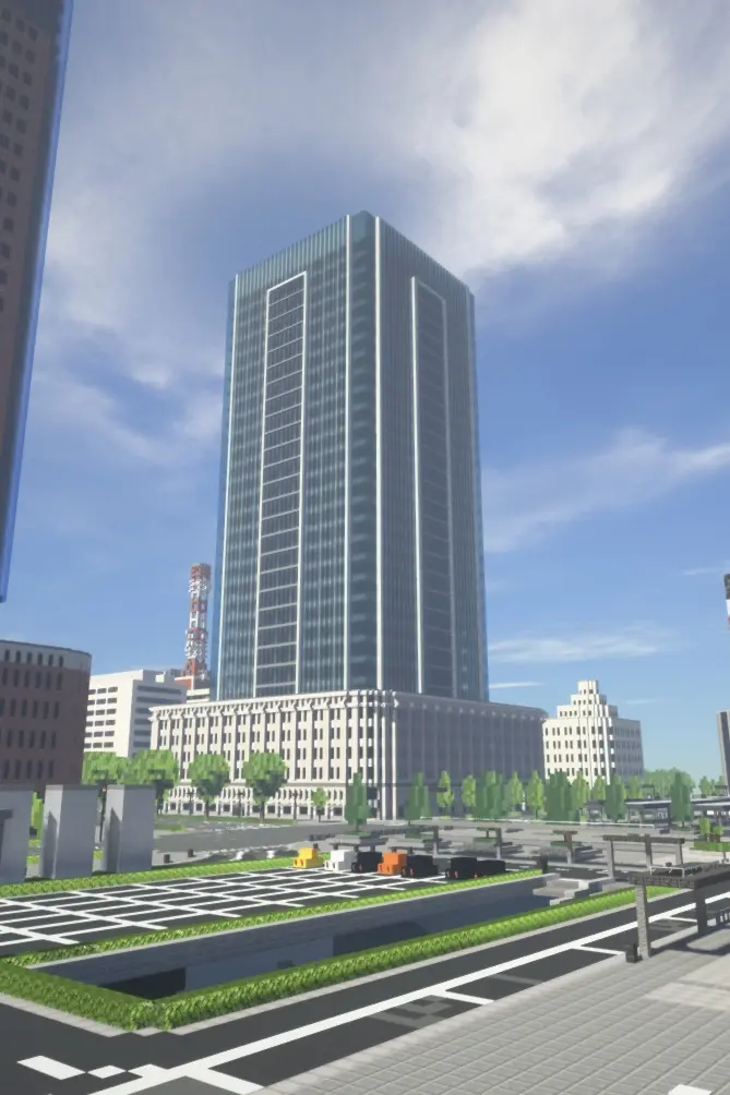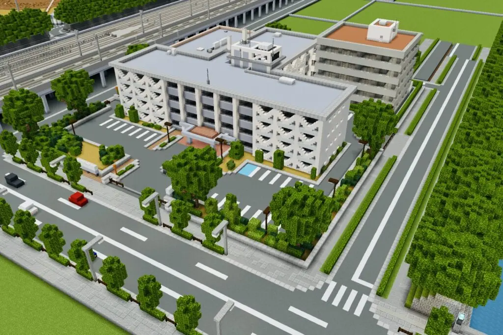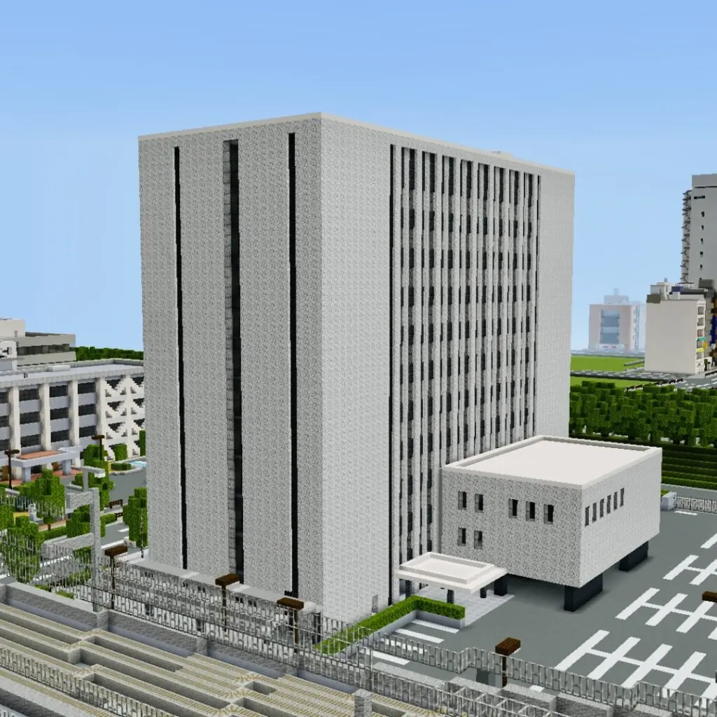 駅北東部には国や県などに関連する施設として裁判所(左下)や法務総合庁舎(右下)を建てました。これらの建物は自分の中でも出来が良かったなと感じており、駅北東部の再開発が行われた際には、そっくりそのまま新たな土地へ移設しました。雑居ビルなどはつくるのは容易ですから撤去も厭わないのですが、このような公共施設は一からつくるのがめんどくさいですし、もったいないと感じますね。ちなみにモデルは水戸地裁と宇都宮法務総合庁舎です。