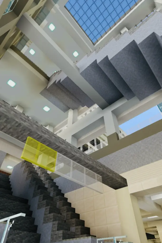 再び駅西の旧城郭内に戻ってきました。取り掛かったのは、県庁舎の改修です。もともと左下のような真っ黒なビルだったのですが、景観的に問題だと考え、デザインを右下のように一新しました。もともとこのビルは戦前に低層部がつくられ、戦後に高層棟が増築されたという設定でした。いわゆる腰巻ビルです。