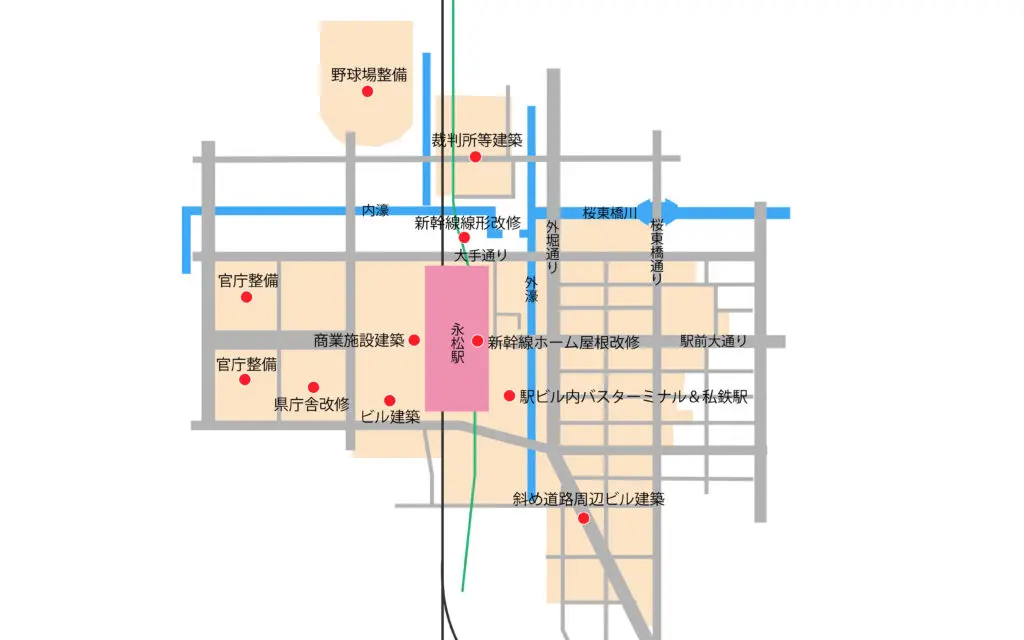 先ほどの県庁の向かい、駅の西口の開発も進めました。具体的には商業施設を建てました。東口がビルだったのに対し、西口の施設は低層にとどめました。理由は、県庁や市役所の低層階の階高と一致させ、スカイラインを統一させるためです。東京の大丸有地区や大阪の御堂筋では、ビルの高さをそろえることで良い景観をつくりだしています。永松駅西口地区においてそれを実現したかったため、このような措置をとりました。